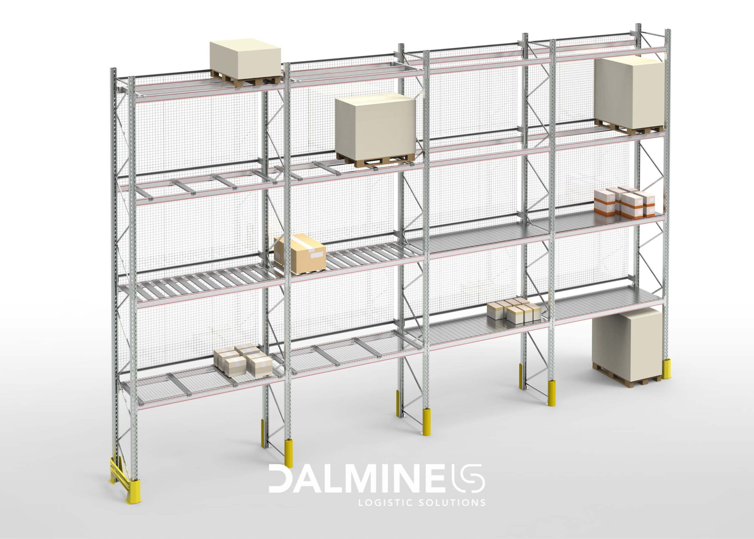 Sistema adattabile a qualunque layout, al peso e al volume della merce. Lo scaffale permette l’accesso diretto ad ogni singola locazione ed un facile controllo dello stock, idoneo ad un alto numero di referenze, con un basso impatto economico. Sistema di magazzino adattabile a qualsiasi spazio e sempre implementabile ed aperto a nuove configurazioni, Dove è necessario combinare del picking manuale, è possibile realizzare dei ripiani continui ai livelli più bassi.